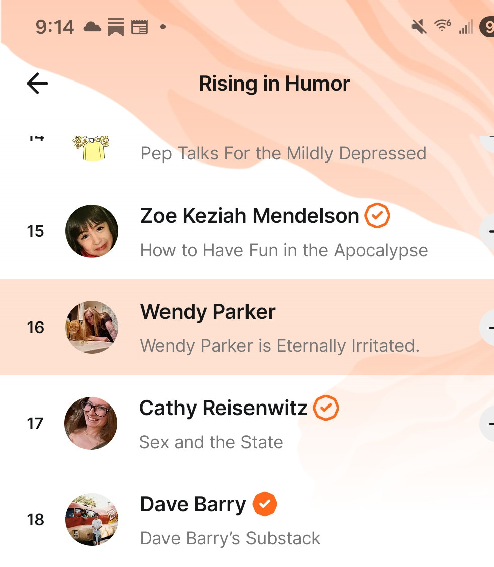 It’s nice to start my Thursday morning with a #16 Rising in Humor. I magically cracked the top 20 without posting anything for the past three days. Maybe I’m being awarded for shutting the hell up for a day or two - who knows? I certainly don’t feel like I earned it - full disclosure: I have 1,722 subs, with 65 of those being paid. Surely I’m not the #16 earner on Substack’s humor list. Am I?